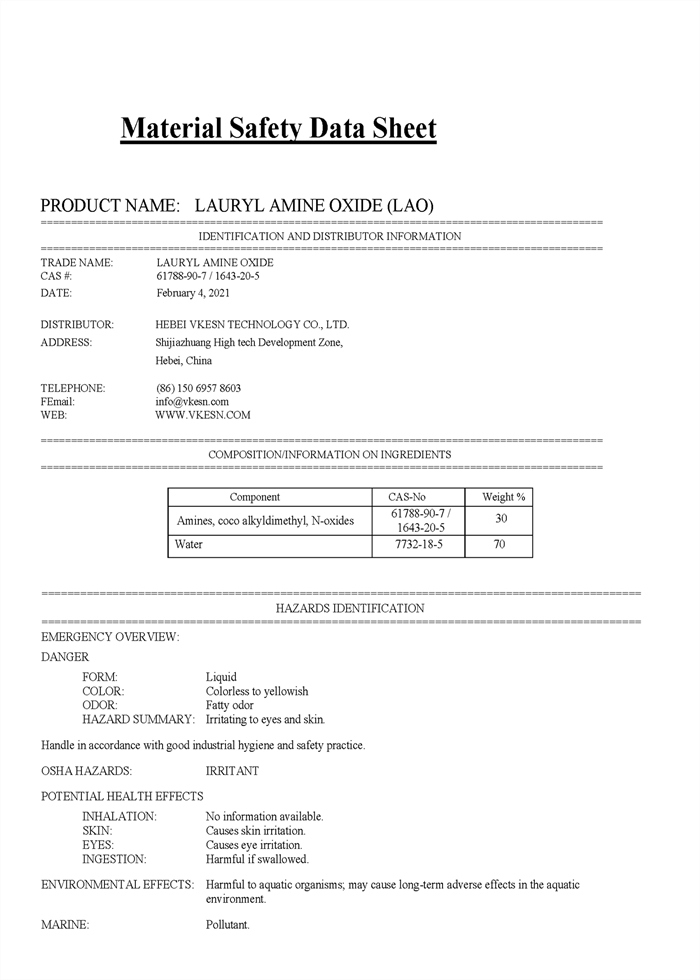 Amine oxide (OA) is an oxide that directly combines oxygen with nitrogen atoms in tertiary amine molecules. The weak alkalinity of amine oxide makes it exhibit non ionic properties in neutral and alkaline solutions, and cationic in acidic media. It is a multifunctional amphoteric surfactant.