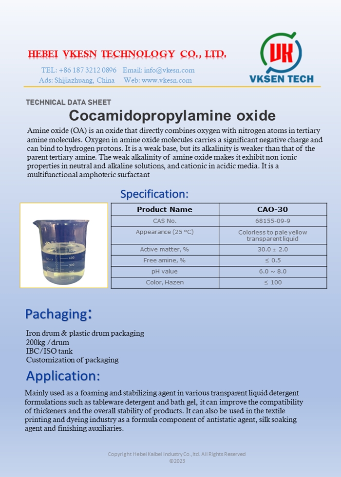 Amine oxide is easily soluble in water and polar organic solvents, and is a weakly cationic amphoteric surfactant. Aqueous solutions are cationic in acidic conditions and non ionic in alkaline conditions. Has good thickening and anti-static, softness, foaming, foam stabilization, and decontamination properties; It also has the ability to kill bacteria, disperse calcium soap, and has good biodegradability, making it an environmentally friendly daily chemical product.